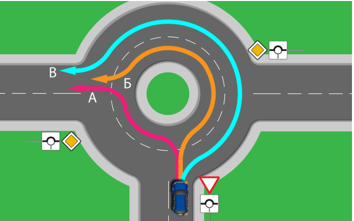 Так куда же всё-таки можно двигаться автомобилю. На рисунке представлено три направления А, Б, В. Перед автомобилем знак «уступить дорогу» и дополнительно указано направление «главная дорога». В данном случае целесообразно применить понятие «помехи справа» и указание направления «главной дороги». Необходимо забывать, что отсутствие знака «круговое движение» не запрещает возможность встречного движения.