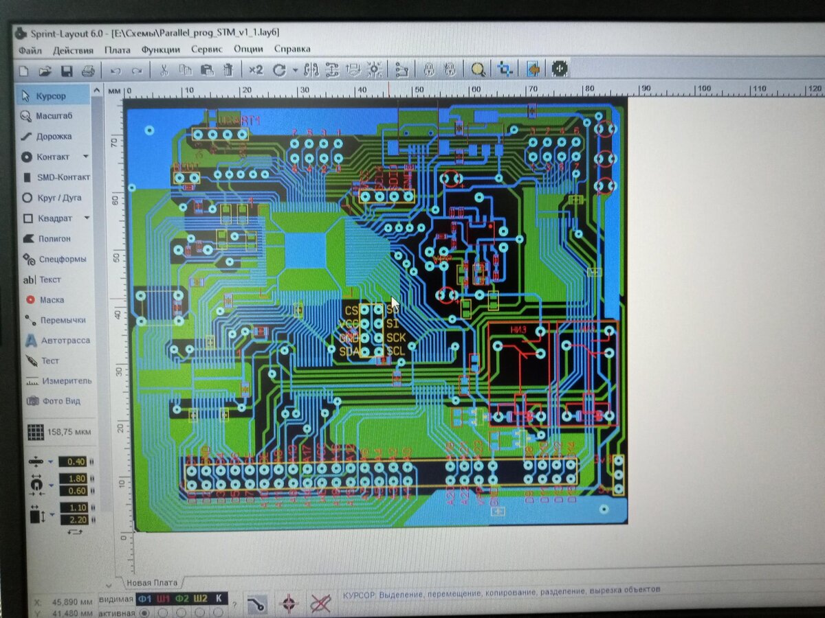 Для примера я буду приводить фотографии процесса изготовления достаточно сложной платы с деталями в SSOP24, TQFP100 и других SMD корпусах с шагом от 0,5 мм, если я не ошибаюсь. Это плата для моего проекта - USB программатора параллельных Flash и EEPROM микросхем памяти.