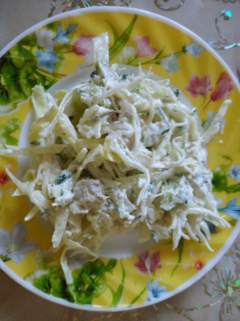 Мясо нарезаем кусочками , капусту соломкой , огурец на крупной терке.Все перемешиваем. Вкусно просто и быстро.Салатик очень сытный . Можно применять в меню когда сидишь на диете проверено автором.Только полезности.