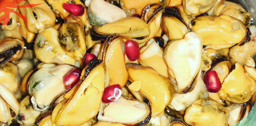 Затем заливаем мидии маринадом из сотейника, добавляем 4 ложки гранатового сока, горсть целых зерен. Очищаем лук и чеснок от шелухи, лук нарезаем полукольца, чеснок измельчаем и добавляем к мидиям. Далее вливаем масло, кладем имбирь, кориандр. Все перемешиваем и оставляем мариноваться на 7 часов. Блюдо готово. Приятного аппетита!