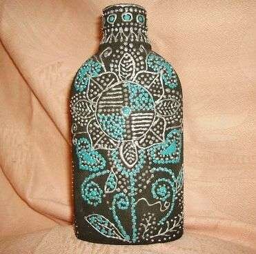 — силикатный клей (жидкое стекло). Подготовьте цветной эскиз рисунка в истинную величину. Обезжирьте поверхность стекла нашатырным спиртом и нанесите на бутылку очертание рисунка темным маркером. Покройте одну сторону бутылки слоем силикатного клея и выложите стеклянную мозаику. Работать безопаснее в плотных перчатках. Когда стеклянные осколки «прихватятся», залейте оклеенную поверхность сплошным слоем силикатного клея, чтоб он покрыл все острые сколы. Подождите, пока поверхность затвердеет всецело. Переверните бутылку, .повторите такую же операцию на примыкающей-плоскости бутылки и т. д., пока «витражом» не покроется все изделие. Не считая силикатного клея можно также применять эпоксидный клей либо полиэфирную смолу.