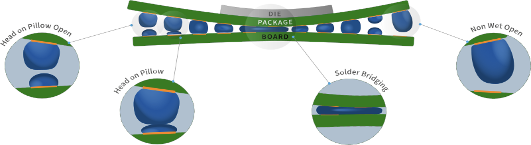 На рисунке 1 показано несколько различных типов дефектов, которые могут возникнуть в процессе оплавления корпусов BGA.