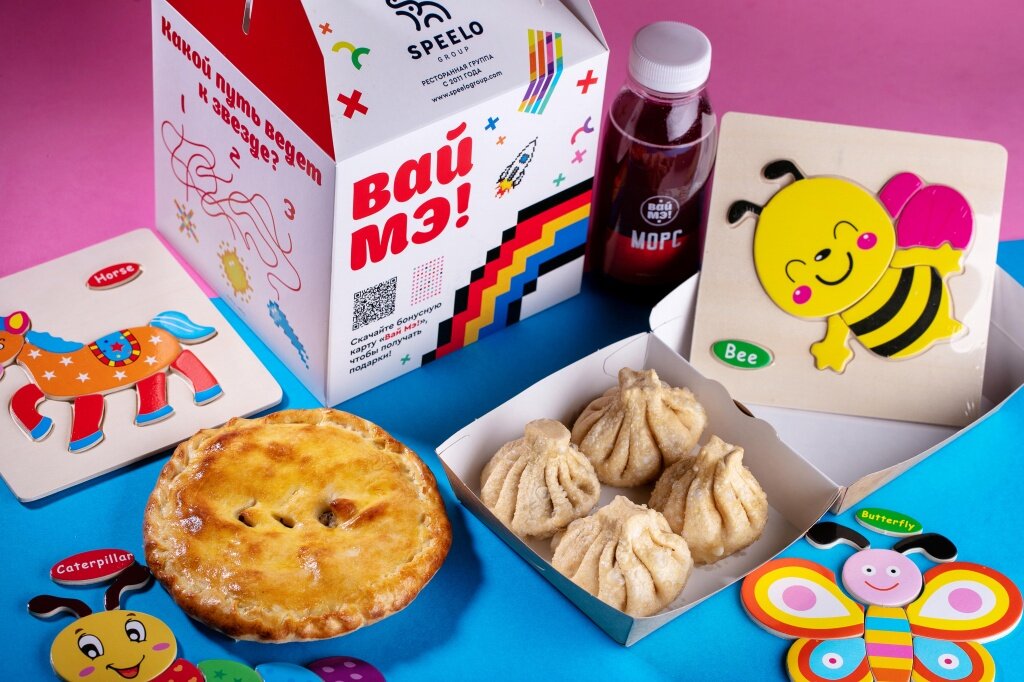 Внутри — детская версия грузинского застолья: мини-хинкали с соусом на выбор, мини-хачапури с сулугуни или мини-кубдари, морс или компот и, конечно, игрушка. Все вместе мы отдаем в