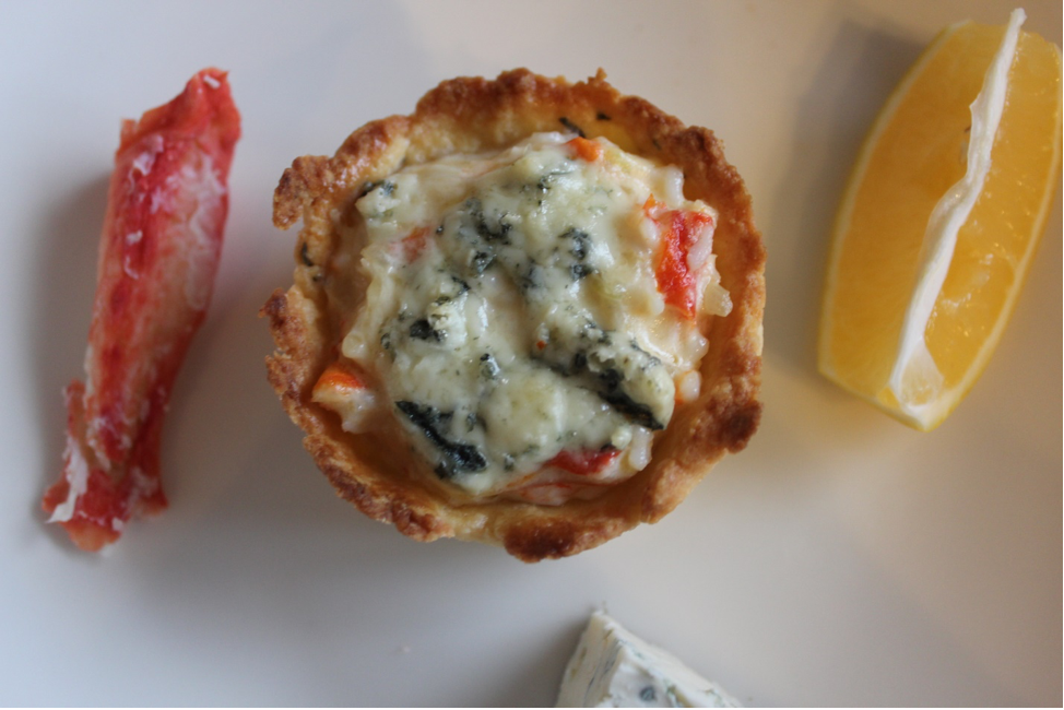 8. Вынем корзиночки из духовки и дадим им немного остыть, потом положим в них получившуюся начинку и сверху положим немного сыра дор блю. Замечу, что ни на одном этапе приготовления мы ничего не солили, так как сыр дор блю, который мы сейчас добавили, имеет достаточно соленый вкус.