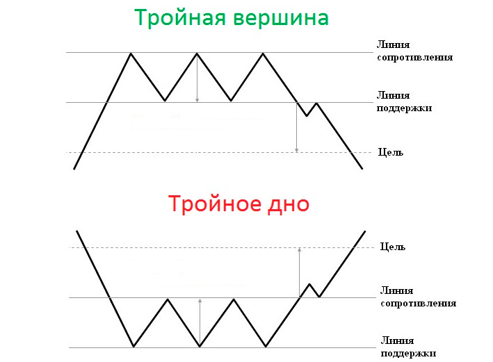 Паттерн: тройная вершина или тройное дно - то фигура разворота рынка. Это одна из самых популярных разворотных фигур. Она легко определяется на графике, но новички обычно путают ее с двойной вершиной, что бы не допустить такой ошибки, нужно просто уделить анализу рынка чуть больше времени, тогда все станет ясно.