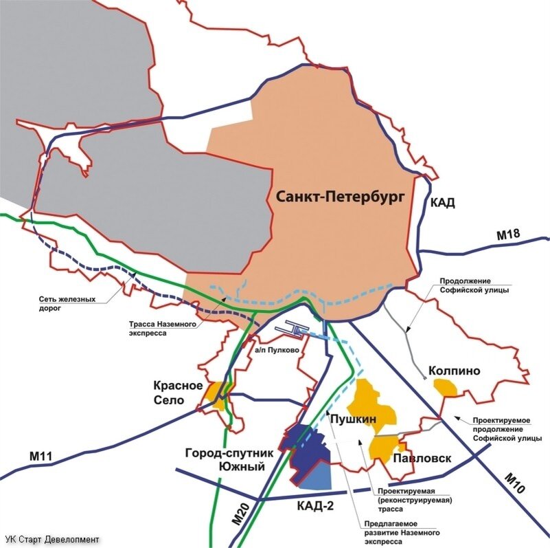 Расположен он будет рядом с Пушкиным. Основной артерией соединяющий Южный с СПБ будет являться Киевское Шоссе.