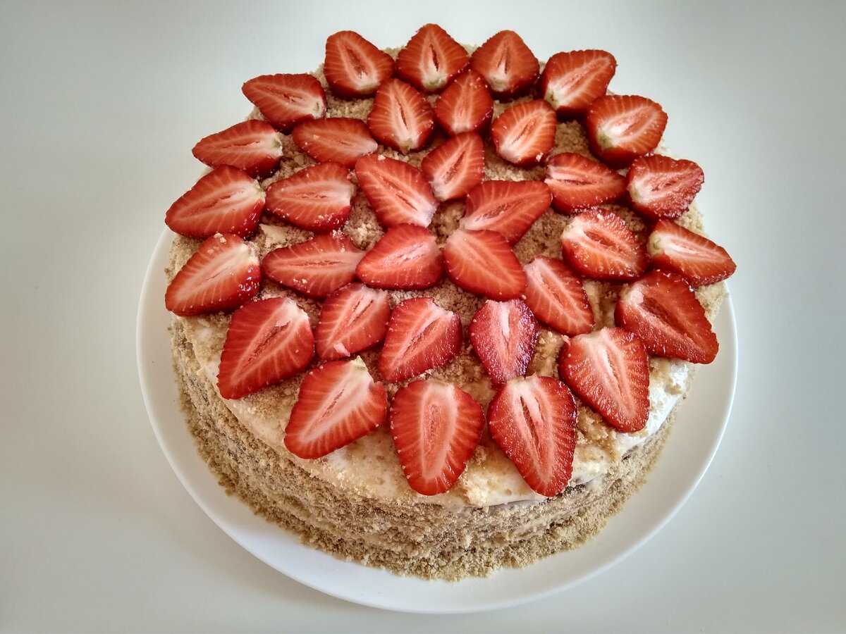 Один корж я выпекаю для украшения и натираю на крупной терке. Обсыпаю торт со всех сторон и украшаю ягодами, шоколадом или орехами.