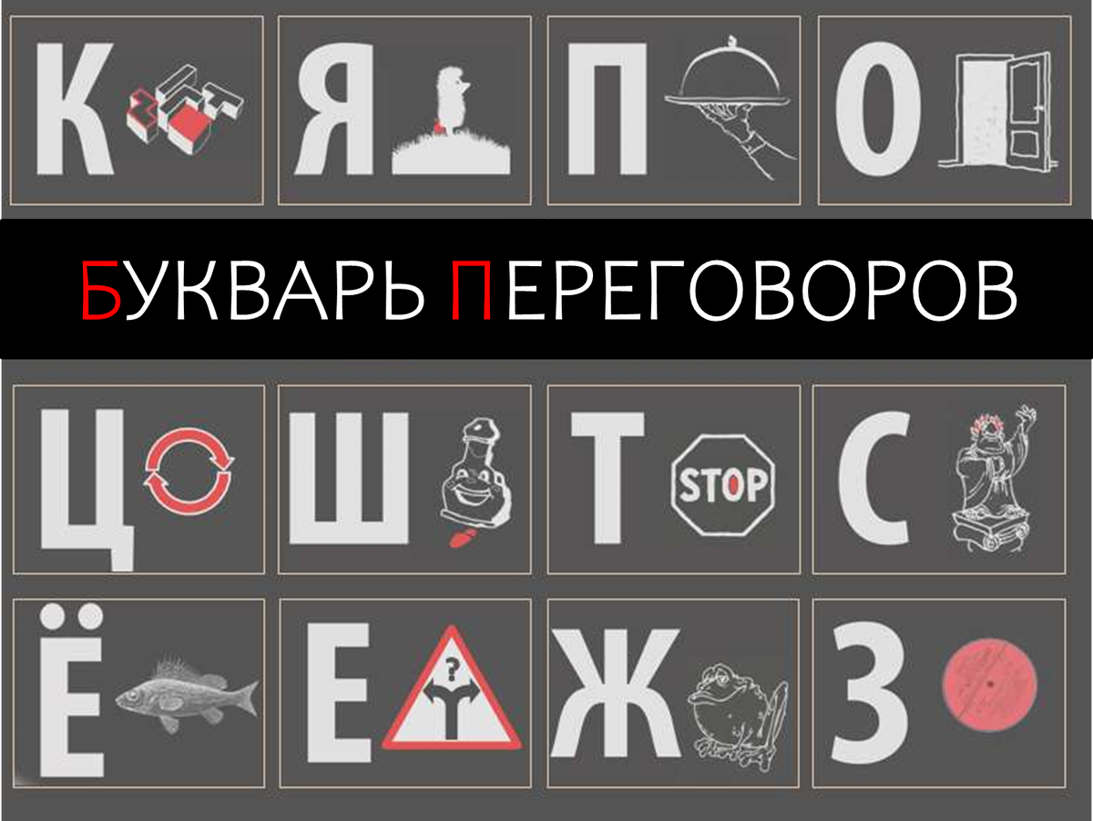 Как и в обычном букваре, в Букваре переговоров каждая буква относится к определенному инструменту переговорщика, который с нее начинается. А для понимания и запоминания, Букварь предлагает вам расшифровку и несколько подсказок, связанных с «буквой».