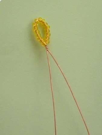 Для начала следует взять узкую проволоку длинноватой 1 метр, сложить напополам и набрать на нее 16 бисеринок. Протянуть их на середину проволоки, в место сгиба. Закрутить, образуя петельку. Потом концы проволоки разъединить, набирая на каждый по 8 штук бисера. Сейчас проволочку опять придется скрутить на два полных оборота. На данный момент уже вышло две петельки. Таковых петелек необходимо сплести 5.