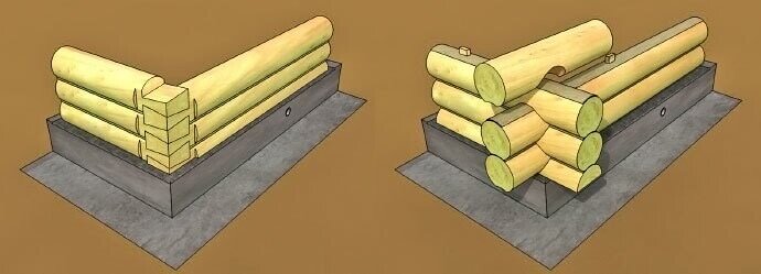 1. На фундамент укладывается первый ряд обтесанных бревен (нижний венец с шириной затесов не менее 15 см).