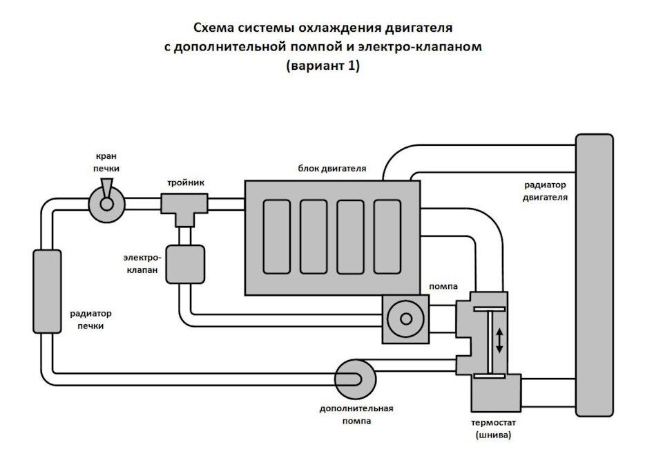 Здесь клапан соединён с термостатом, а дополнительная помпа с помпой двигателя.