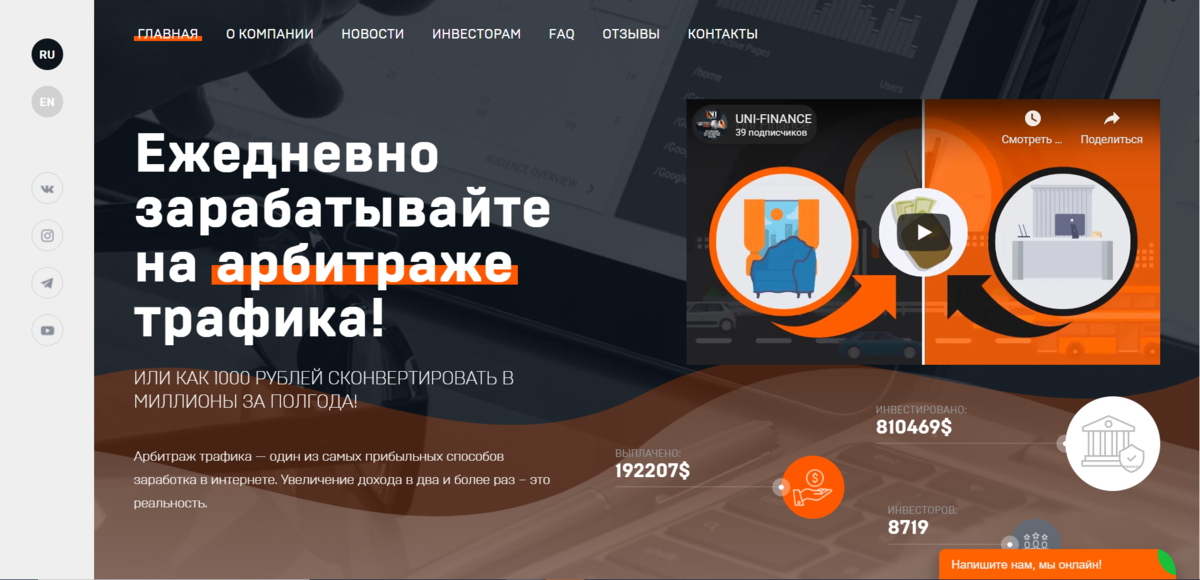 Инвестиционная платформа Uni Finance , предоставляет возможность заработка от 60% в месяц без каких-либо профессиональных знаний и это не предел! В зависимости от вложенной суммы, наши партнёры получают более 108% чистой прибыли в месяц на полном пассиве. Маркетинг реферальной и бонусной программы дают практически не ограниченные