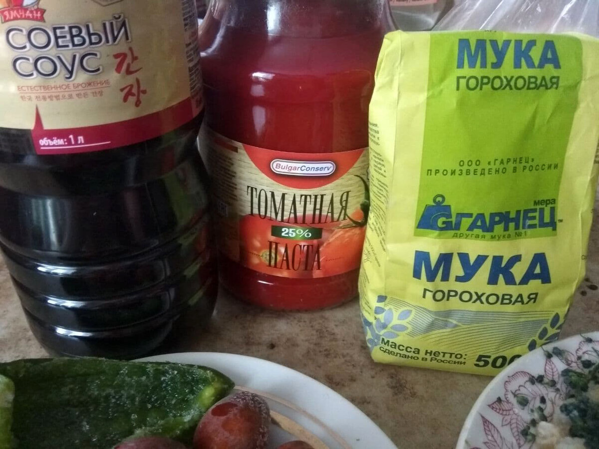 2) Смешайте гороховую муку с водой, соевым соусом, 1 ст. л. томатной пасты и специями. Смесь должна получиться однородной и по консистенции напоминать жидковатую сметану.