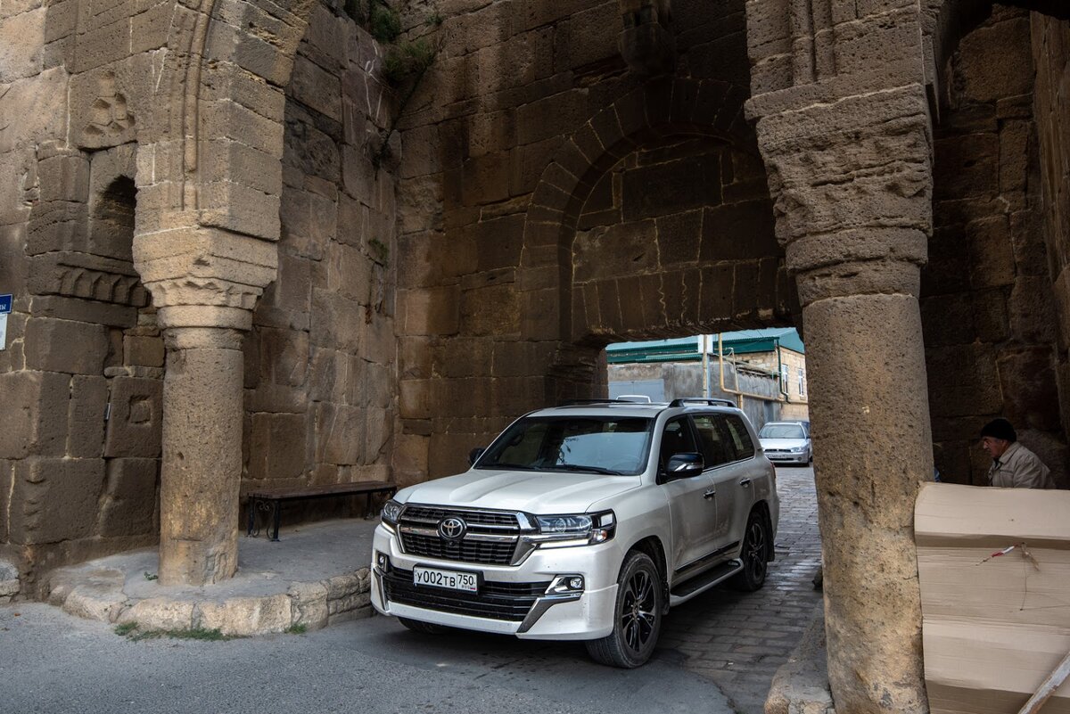 Чтобы на себе ощутить, что такое Дербент, мы сначала поднимемся к цитадели, крепости Нарын-кала, расположившейся на доминирующей высоте над городом проходом между горами и морем. Вообще передвижение LC200 в горной местности вызывало только восхищение. Дизельный двигатель 4,5 л V8 на 249 сил очень тяговитый, и его мощности с запасом хватает, чтобы передвигаться в горных условиях. Заехать даже по самому неровному косогору нам помогают электронные помощники и система выбора режимов движения Multi-Terrain Select, ловко распределяющие крутящий момент между осями и не дающие попусту проскальзывать ни одному колесу. Машина будто вгрызается в крутой песчаный склон, при этом пассажиры не испытывают даже малейшего дискомфорта, будто едут по шоссе, просто под уклоном. На крутых подъемах и спусках можно воспользоваться внедорожным круизом Crawl Control, доверив автомобилю управление газом и тормозом в сложных условиях.