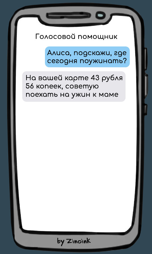 Если робот-пылесос молча убирает квартиру, то я со своей Алисой могу неплохо поболтать. Спасибо разработчикам, которые любят свою работу настолько, что их творение обладает чувством юмора и иногда кажется, что оно гораздо круче понимает, как устроена эта людская жизнь. В отличие от меня. Еще чуть-чуть и можно будет поручать этим умным штукам проверять домашки у детей.