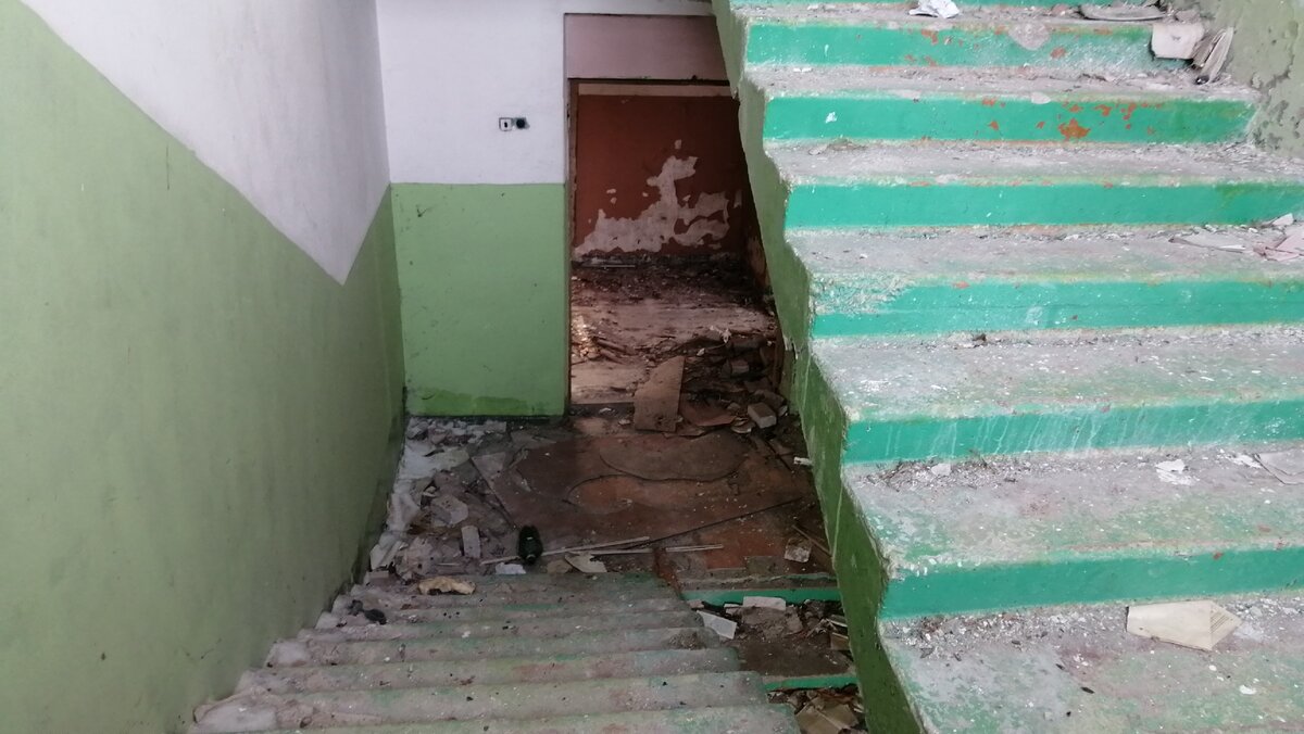 В этой школе на второй этаж ведут две лестницы. Как мы видим, что действительно остались только лестницы. Перил давно уже здесь нет. Мусора здесь хватает.