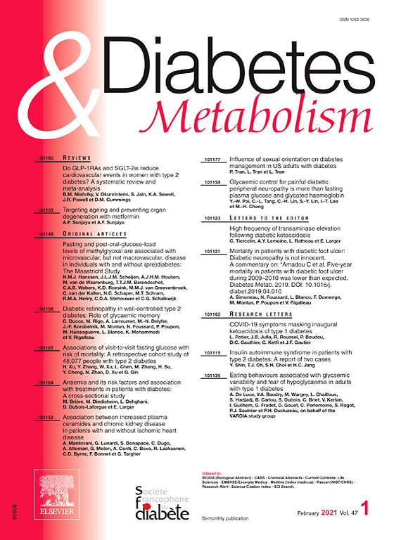Уважаемые коллеги, доброго времени суток! Представляем вам французское научное издание Diabetes and Metabolism. Журнал имеет первый квартиль, издается в Elsevier Masson, его SJR за 2019 г. равен 1,429, импакт-фактор - 4,731, электронный ISSN - 1262-3636, предметные области - Эндокринология, Эндокринология, диабет и метаболизм, Медицина внутренних болезней, Общие вопросы медицины. Вот так выглядит обложка: