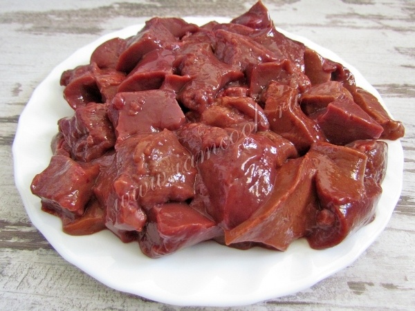 Берем говяжью печень, у меня 500 грамм обмываем в холодной воде и очищаем от пленок и нарезаем произвольно вместе со шпиком небольшими кусочками.