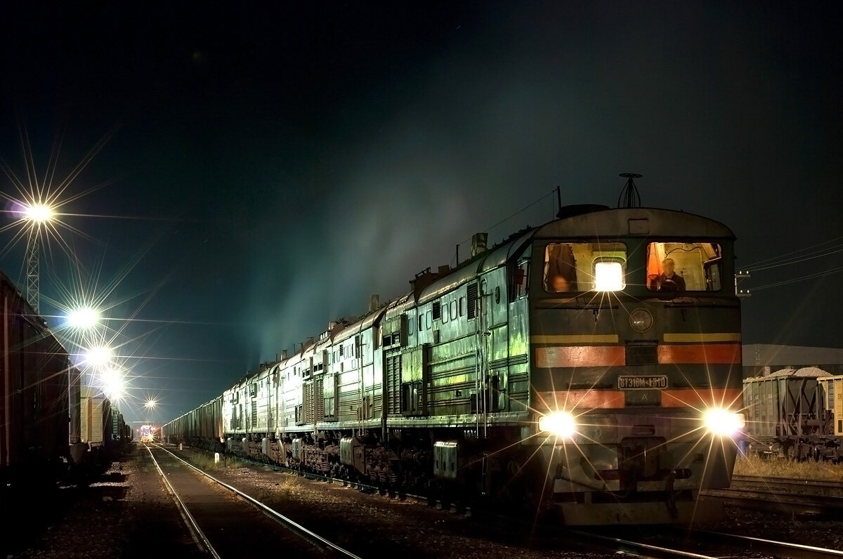 Время на часах 11 вечера, думаю сходить в душ и лечь спать, надеясь что где-нибудь под утро вызовут в поездку. Как только потешил себя этой мыслью - звонок от нарядчика: "явка на 18:30" (с указанием направления). Мысленно придя в режим полной мобилизации, "заряжаю шарманку": проверяю фонарик, собираю пайку. Есть время перед дорогой присесть и хлебнуть чая по крепче.... Уже четвёртая поездка подряд в этом месяце явкой на 18:00, быть в бодром состоянии ума и духа надо как минимум завтра до полудня... И честно, поймал себя на мысли, что привык к ночной дороге - она какая-то особенная, загадочная, таинственная... Даже тепловоз (как я и писал, что тепловоз- живое существо), работает как-то по-особенному, отдавая все свои силы, а приборы на пульте управления говорят тебе: "мы не подведём..." Тусклый свет в дизельном помещении создаёт особую ауру. Осматривая поезд в кривой при свете полной луны(на её фоне), видно лёгкий дымок - дыхание нашего коня. Впереди только тьма и какая-то манящая неизвестность, в которой маленькое пятнышко от луча прожектора говорит о свободности пути. Наверное эта неизвестность на мгновение и создаёт ту романтичную обстановку... Как в той песни: "вот новый поворот, что он нам несёт"... Также и здесь... Только чтобы не случилось - ты готов абсолютно ко всему что там ждёт тебя, т.к уверен в своих силах на 100%. Да, такая романтика отчасти для людей сильных духом...