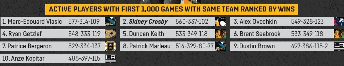 Тысяча матчей за карьеру - достижение хоть и значимое, но не такое уж и редкое. Всего в истории Лиги до этой отметки добирались аж 350 хоккеистов . Конечно, подавляющее большинство из них - яркие представители 20 века, когда игровой век хоккеистов был более долгим. На данный момент в НХЛ выступает целых 25 человек , преодолевших этот значимый рубеж. Однако куда более солидно сыграть 1000 матчей за один клуб. Таких в истории Лиги было уже намного меньше - 57 человек , а действующих игроков с такой цифрой всего лишь 10 , включая самого Кросби. Помимо него это также дуэт из "Сан-Хосе" в лице Патрика Марло и Марка-Эдуарда Влашика , Данкан Кит и Брент Сибрук из "Чикаго", Дастин Браун и Анже Копитар из "Лос-Анджелеса", Патриc Бержерон из "Бостона", Александр Овечкин из "Вашингтона" и Райан Гетцлаф из "Анахайма".
