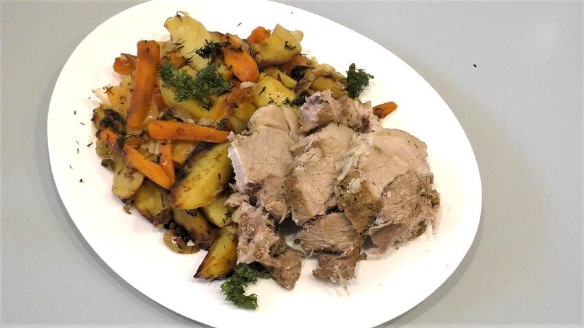 Сегодня у меня очень вкусное блюдо запеченная свинина с овощами. Готовится все предельно просто, не затратно по времени, сложил все в посуду и в духовку в моем случае в мультиварку. Приготовить такое блюдо можно не только на ужин, но и на любое торжество Давайте готовить. Процесс приготовления можно посмотреть в видео ниже. Для приготовления я беру свиной окорок, картофель, можно на этом ограничиться, а можно добавить и другие овощи, в моем случает это лук, морковь и сладкий перец. Чеснок. Чеснок натираю на терке, добавляя к нему чайную ложку соли и молотый перец (у меня смесь перцев), все хорошо перетираю. Обмазываю этой смесью окорок. Пока уберу. Картофель нарезаю крупными дольками, Лук полукольцами, морковь брусочками, перец полосками. Смазываю чашу мультиварки маслом, в один слой выкладываю картофель, лук, морковь, перец. На овощи кладу окорок. Закрываю крышку и ставлю на выпечку. Время приготовления час, когда, мультиварка нагреется, ставлю температуру 90 градусов. Если за это
