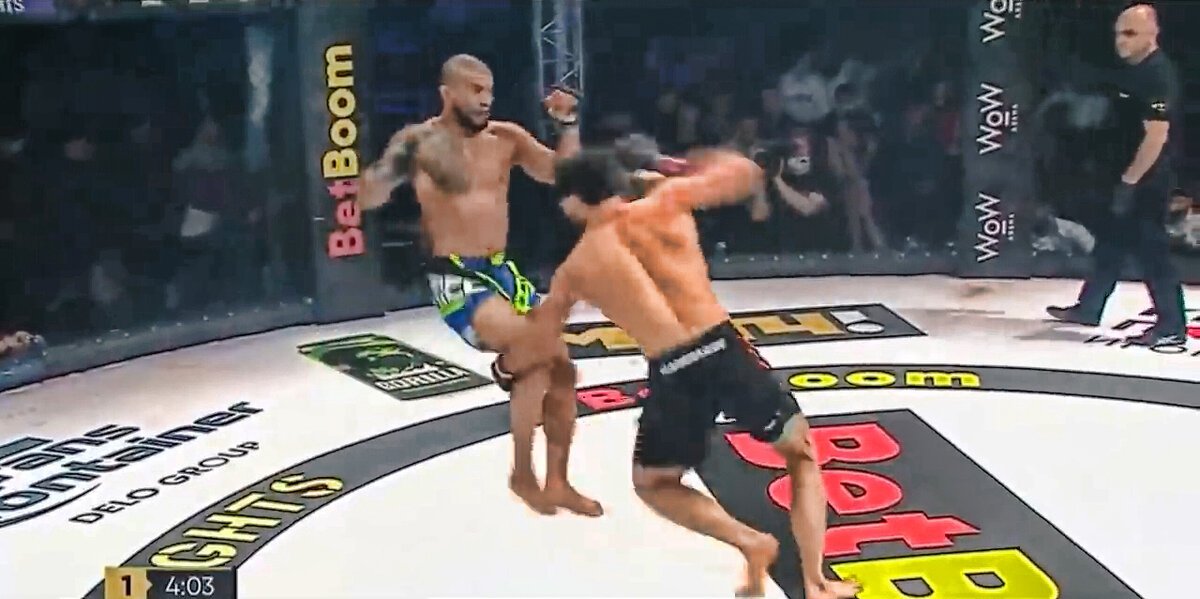 Лишившийся опоры и уже не способный, как обещал, показать красивый бой в стойке, ученик Александра Шлеменко был вынужден броситься оппоненту в ноги, после затяжной борьбы у сетки затащить бразильца в партере, и "размяв" ударами провести болевой на руку.