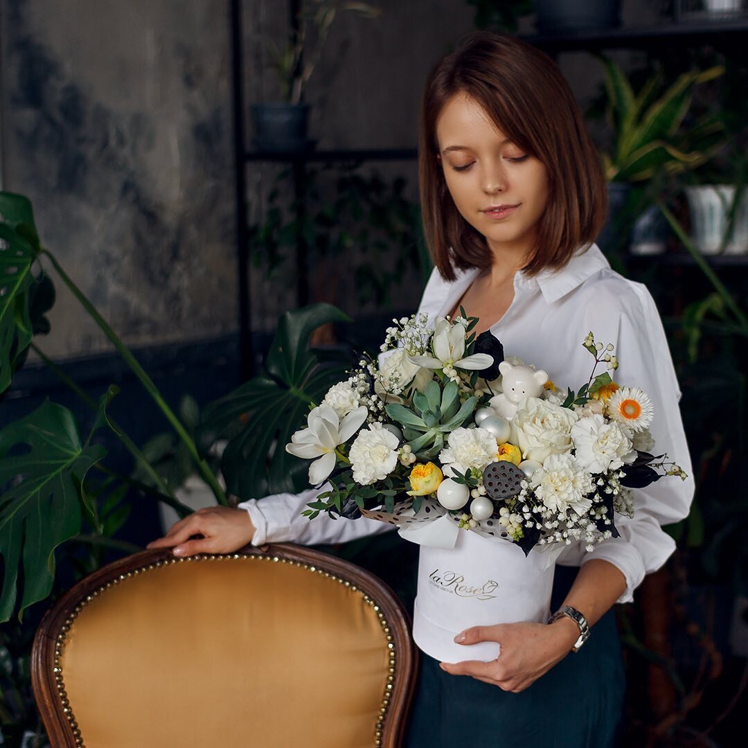 - Большой выбор оформления. Мы можем собрать композицию в корзине, керамическом кашпо, крафтовом боксе или шляпной коробке. Получится полноценное украшение интерьера! Часто клиенты подбирают упаковку под дизайн квартиры.