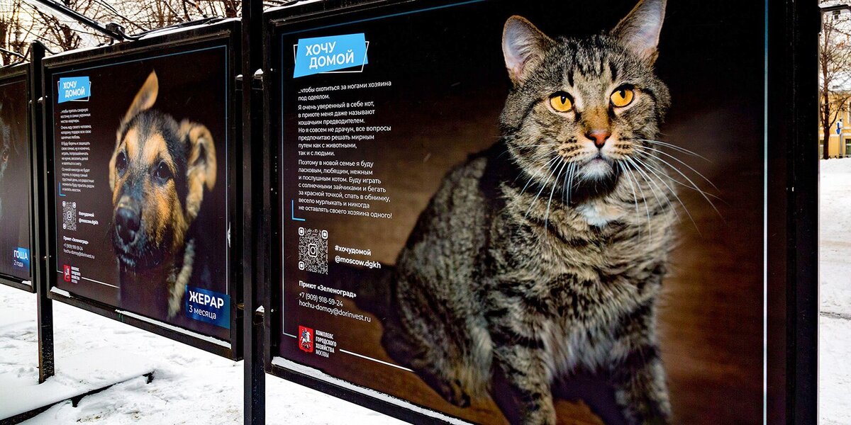 На Цветном бульваре открылась фотовыставка «Хочу домой!», посвященная собакам и кошкам из муниципальных приютов. Она продлится до 10 марта.