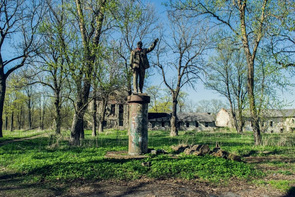 Есть в Ленобласти место, с весьма патриотичным характером Советского союза. Здесь во дворе усадебного комплекса, точнее сказать в руинах бывшей усадьбы, стоит статуя вождю пролетариата. Выглядит весьма атмосферно - Ленин среди руин.