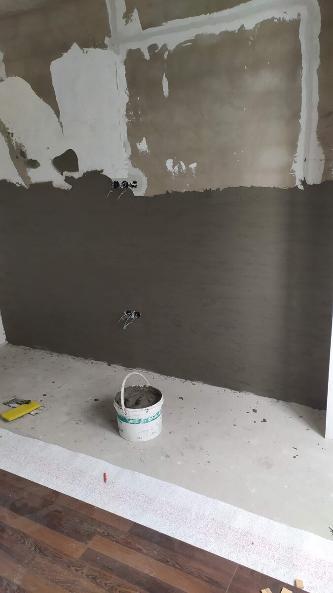 Замешал самый дешевый плиточный клей, который нашел в Lerua Merlen. Нанес на половину стены слоем примерно в 5-10мм. Сразу после этого кусочком фанеры слегка прижимая, делал горизонтальные прерывистые движения. Для получения неровностей.