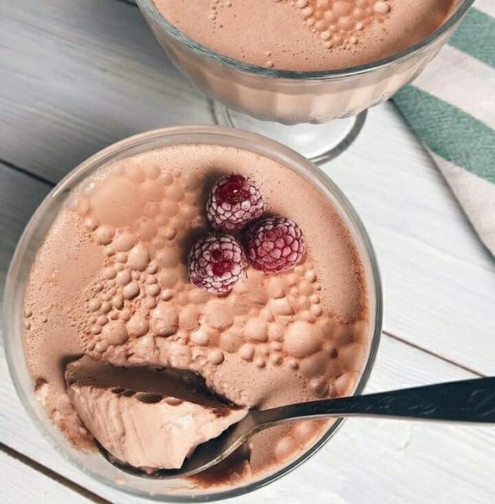 1》 разводим желатин с тёплой водой, перемешиваем до растворения ряженку смешиваем с какао и подсластителем, вливаем желатин.