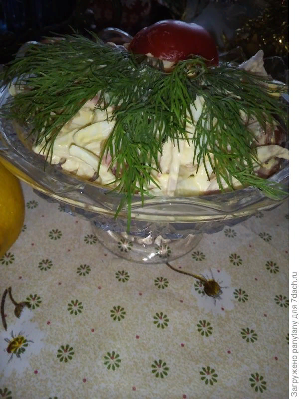 Предлагаю и вам насладиться необычным сочетанием копченого окорочка, крабовых палочек и овощей.