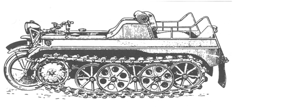 Данная машина представляла собой гибрид мотоцикла и тягача. Ее непосредственным производителем являлась фирма NSU . Официально его наименование в документах встречается как SD . KFZ 2. На данной машине устанавливался 1,5 литровый двигатель фирмы “Опель”. Сама идея подобного гибрида была не нова. Ее выдвинули еще перед Первой мировой войной французы. Они задумывали использовать данное средство для передвижения в полярных экспедициях. Правда, как это в тех условиях бы все работало большой вопрос. Кроме французов в 1928 году нечто подобным занимались и англичане. Пытаясь создать “трехосную” машину повышенной проходимости. В германии это была всем известная фирма BMW . В конце 1940 года данный “зверь” поступает в войска.