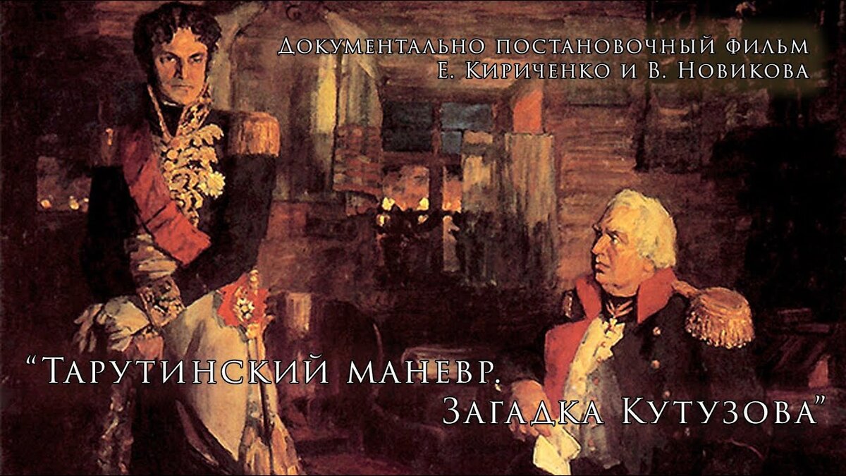 В фильме В. Новикова : "Тарутинский маневр. Загадка Кутузова" рассказывается о маневре русской армии от Москвы к селу Тарутино во время Отечественной войны 1812 года, совершенному по плану и под руководством М. И. Кутузова. Блестяще организованный и проведённый Тарутинский манёвр позволил Русской армии оторваться от армии Наполеона и занять выгодное стратегическое положение, обеспечившее ей