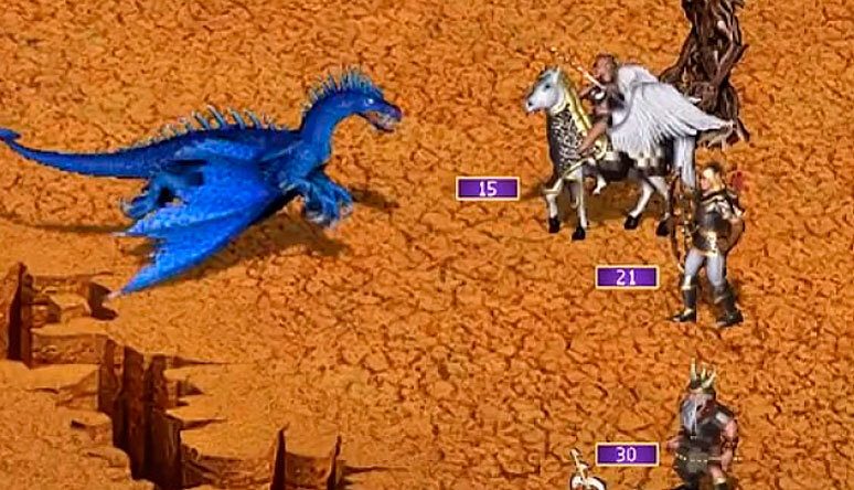 Лазурный дракон по традиции летит в самую гущу, чтобы атаковать сразу два стека одним выстрелом. После этого по традиции все высокоуровневые юниты слетаются возле него, чтобы пинать его по кругу.