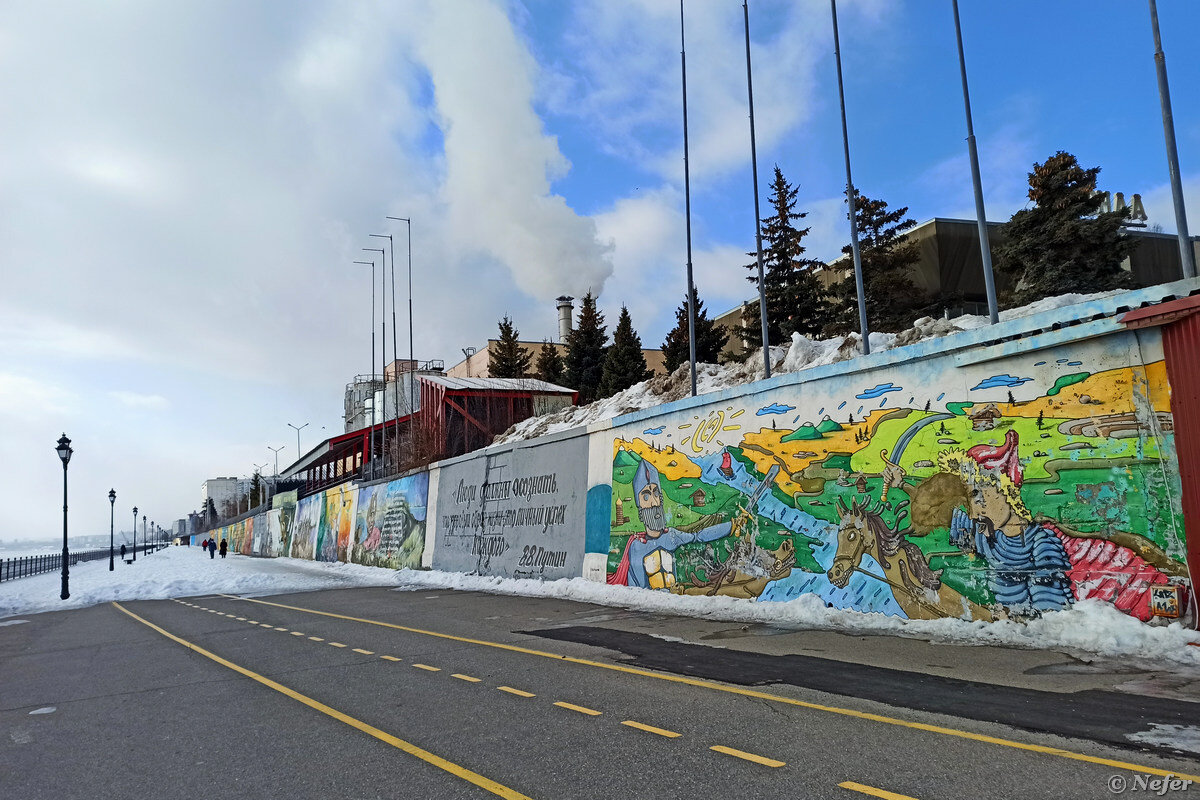 Огромная тепловая электростанция расположена на набережной в центре города. Она шумит, гудит, из труб валит пар, над стеной клубы колючей проволоки. Особенно колоритно все это ощущается, если идешь ближе к реке. Обратно я двигалась вдоль стены, так гораздо тише.