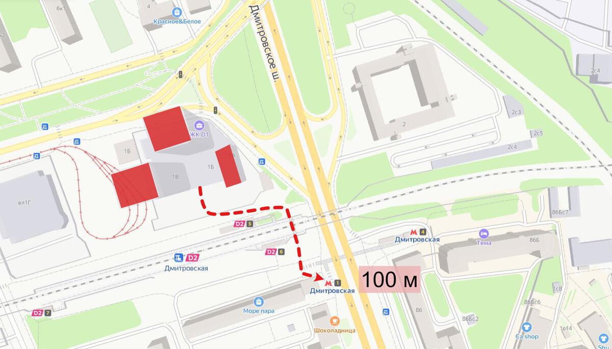 Т.е. очень близко от метро, всего 100 м. Метро в данном случае — станция Дмитровская (серая ветка)