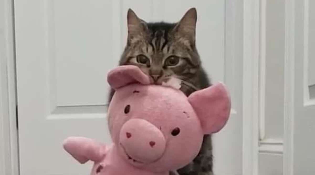Всё началось несколько лет назад, когда один из членов семьи подарил Диего славного розового поросёнка. Коту так понравилась вещь, что с тех пор он стал буквально одержим ею. Хозяева никак не могли взять в толк, почему питомец очарован именно этой игрушкой, но так и не нашли ответа. А МУРлыка всюду носит поросёнка за собой, отказываясь выпускать его из вида.
