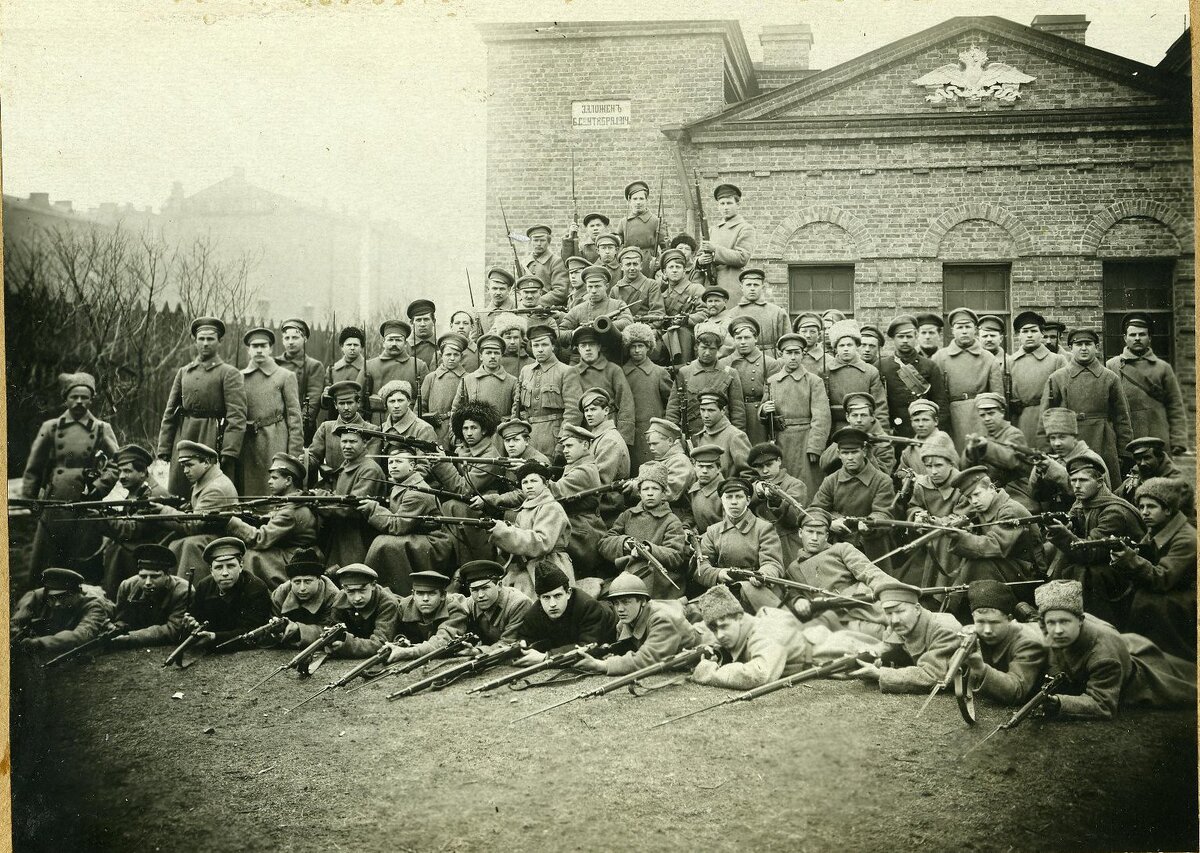 Бойцы с Петроградского фронта. Обратите внимание на форму одежды. Как таковой её и нет. Все одеты, во что придётся. Половина людей вообще похожа на гражданских служащих случайно попавших в кадр. Однако случайных людей тут нет, все эти бойцы шли и воевали за свое дело, которое на тот момент им казалось правым.