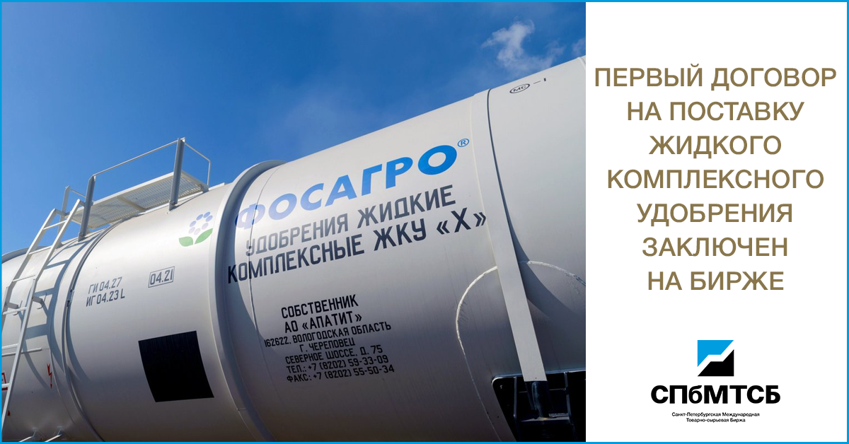 20 февраля на СПбМТСБ был заключен первый договор на поставку жидкого комплексного удобрения. В ходе торгов было реализовано 130 тонн минудобрений с биржевого базиса поставки станция Кошта (Вологодская область) на