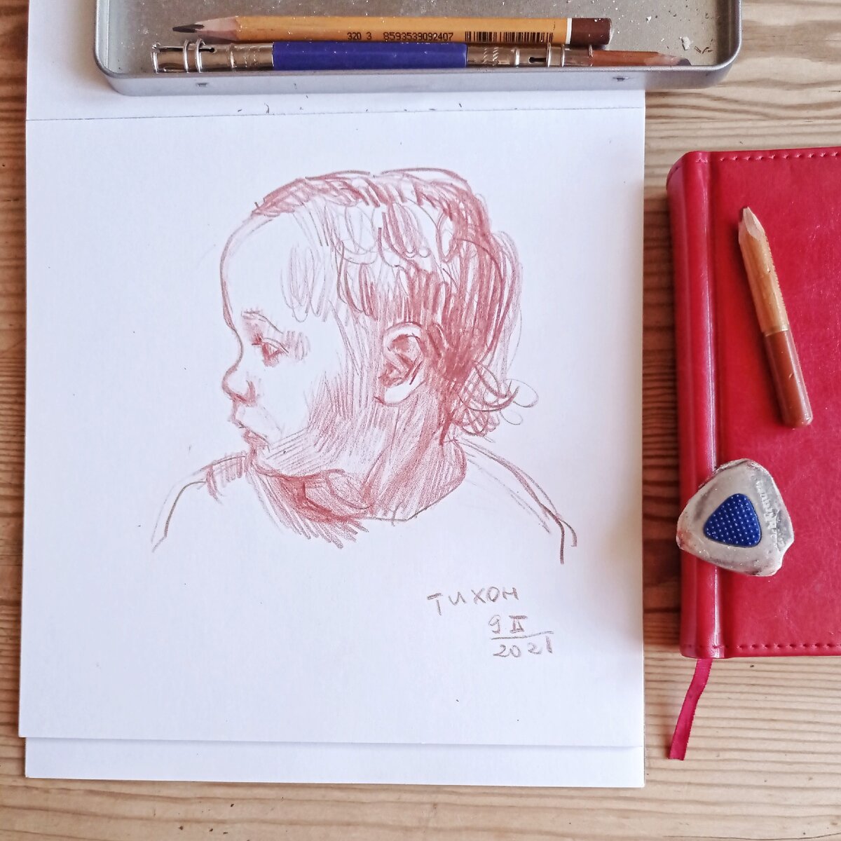 Рисовать спящего ребёнка одно удовольствие! Даже если он передвинется в процессе, всегда можно взяться за новый лист, а к старому обратиться позже, когда модель вернётся в прежнее положение. Впрочем, дошкольницу я могу повернуть, она не просыпается.