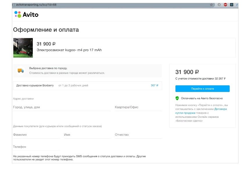 Заполнил необходимые поля, ввел данные карты, подтвердил оплату. Я и не подумал, что ссылка ведет на поддельную страницу, которая практически в точности, копировала стандартную форму Авито. Надо ли говорить, что ни денег, ни самоката я так и не увидел.