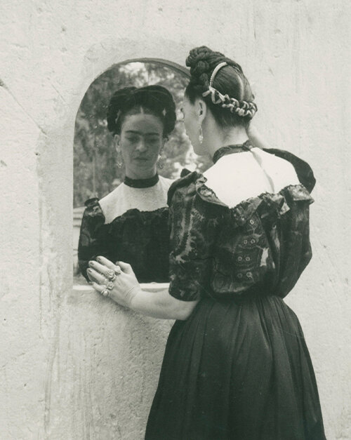 Фрида Кало смотрит в зеркало. На ней черно-белая блузка и длинная черная юбка, а волосы заплетены в косы и уложены в высокую прическу. Мы видим и ее, и ее отражение – две Фриды. Это лишь одна из серии портретов художницы, сделанных в 1944 году ее подругой Лолой Альварес Браво, первой женщиной-фотографом в Мексике. Эти образы Кало в ее саду так ясно отражают саму суть взаимоотношений художницы с остальным миром: смотря на Фриду, мы смотрим на себя.