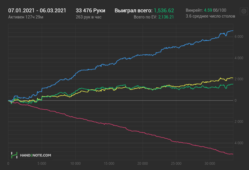 Из сравнения с предыдущем графиком видно, что ГСЧ крутится не в ту сторону. Тем не менее, лавеха все равно мутится, банкролл за эту неделю немного вырос, так что "Ваша казна растет,