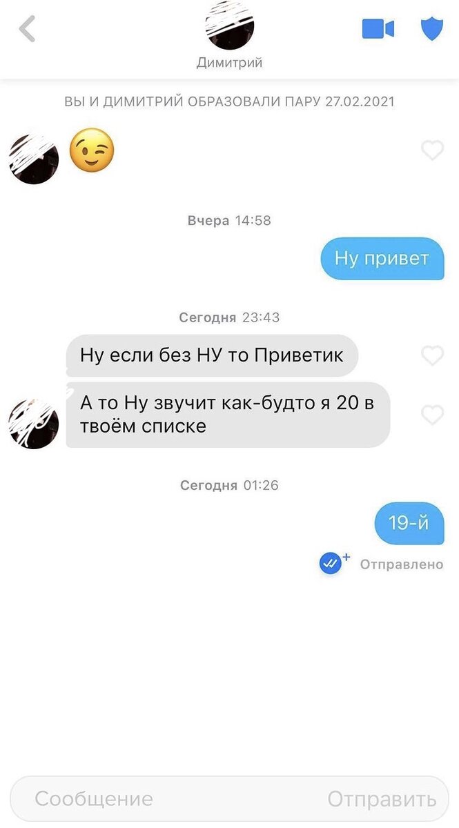 Мужчина начал общение со смайлика. Что ожидал в ответ? Тоже смайлик? А дальше что? Девушка оказалась умней и поздоровалась. Она явно не оценила такое ленивое и незатейливое начало диалога.