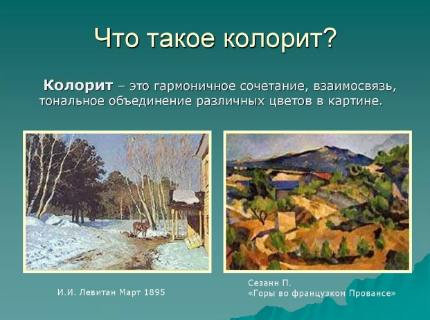 Важно : стоит различать определения «колорит» и «колоризм». В том же духе, как любую картину, созданную красками, мы отнесём её к живописи, однако не любую работу прозовем живописной, так же цвет есть у каждой картины, однако колоризм – качество особое. прочуять и подчинить её цвет, профессионально делая его вдруг и правомочным победителем картины, и неизменным дополнительным лекарством ради передачи своей идеи, горазд не всякий живописец. Между живописцев имеется поговорка: «Рисунку возможно научить, однако колористом необходимо родиться».