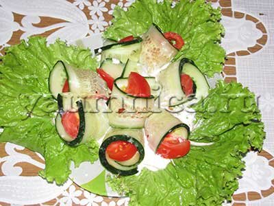 4. Берем пластинку огурца и кладем на край ломтик помидора. Аккуратно заворачиваем в рулет. Огуречная пластинка не должна развалиться. Теперь устанавливаем наши рулетики в середину тарелки вертикально.