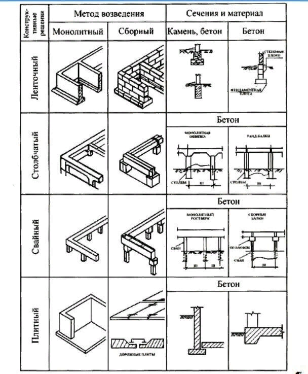 Итак, фундамент бывает разных видов, каждый из них подходит под определенные характеристики постройки, и вот основные из них: