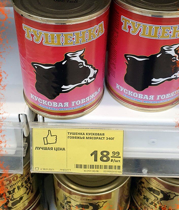 Обратите внимание, как крупно написано "Тушёнка" и "Кусковая говяжья". От такой цены, конечно, глаза округлись от удивления. Сначала подумал, что может это ошибка, но на ценнике всё чётко указано. И даже год 2021, а не 2000. Тогда нормальная тушёнка вроде так и стоила. И хоть понимал, что внутри может быть всё что угодно кроме мяса, я всё таки решил купить и посмотреть, что внутри банки.