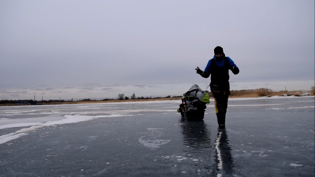 Прибыли на место, и дорога в этот раз не принесла сюрпризов. Есть на пути к водохранилищу 2 противных переезда, редко когда удается их проехать, не потеряв 20-120 минут) В этот раз пролетели "как по маслу"). Приключения же начались уже на пешей части пути) Поклажа у нас огромная, дорожка через камыши узкая и извилистая, будто первопроходцем был изрядно набравшийся допинга брат по увлечению). Да к тому же снег со всей акватории нашим серьезным степным ветром сбило как раз в эти самые камыши)) Пролезли, кое как) а впереди еще интереснее) Тот самый ветер превратил лед водохранилища в идеальную гладкую поверхность) Сказать, что скользко - это ничего не сказать!) И идти всего 500 метров, но как же нелегко они дались)